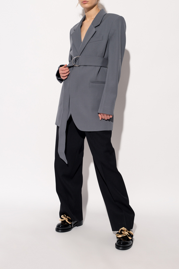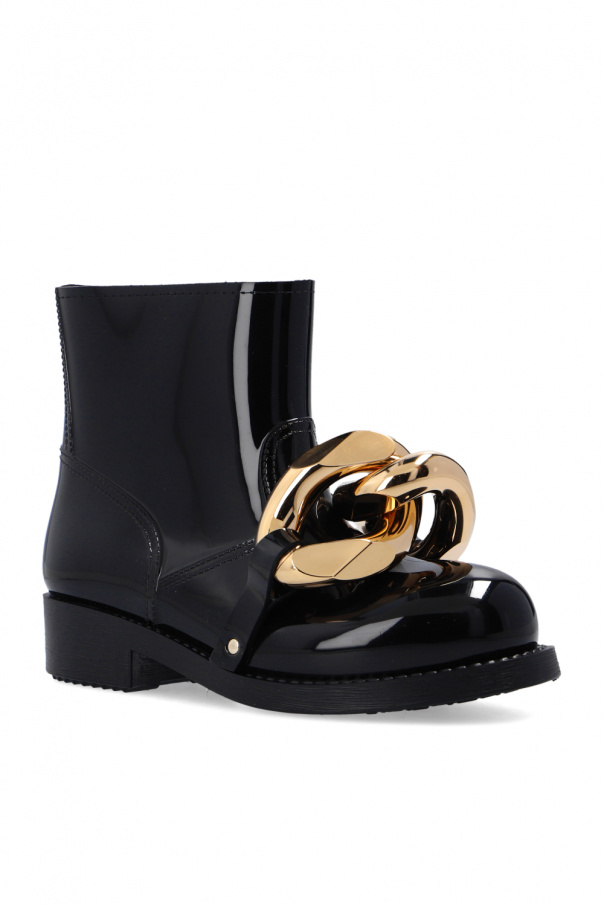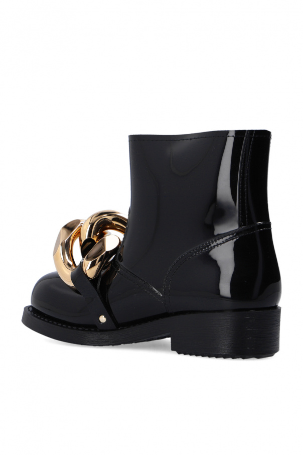 Short, black rain boots from JW Anderson. Decorated with a metal chain link appliqué in gold-tone, this pair rests on a black rubber sole.