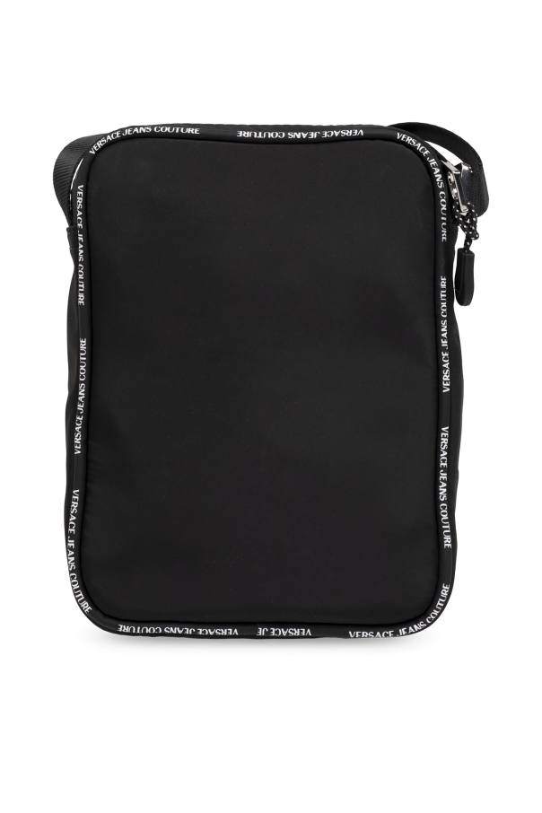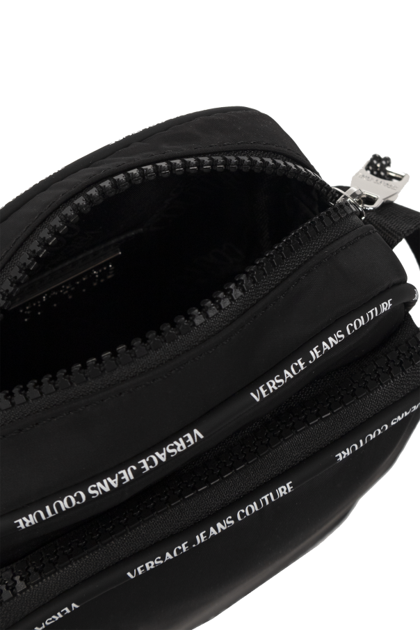 Black shoulder bag from Versace Jeans Couture. Made of fabric, this model fastens with a zip and is decorated with a white monogram and rubber logo patch. It is complete with a front zip pocket, adjustable shoulder strap, silver-tone metal hardware and one internal compartment with one slip pocket.