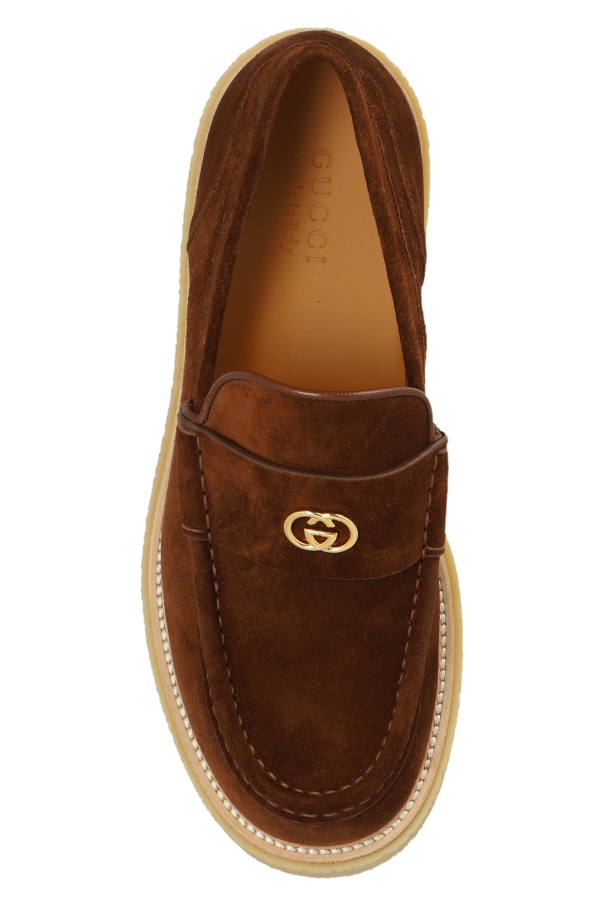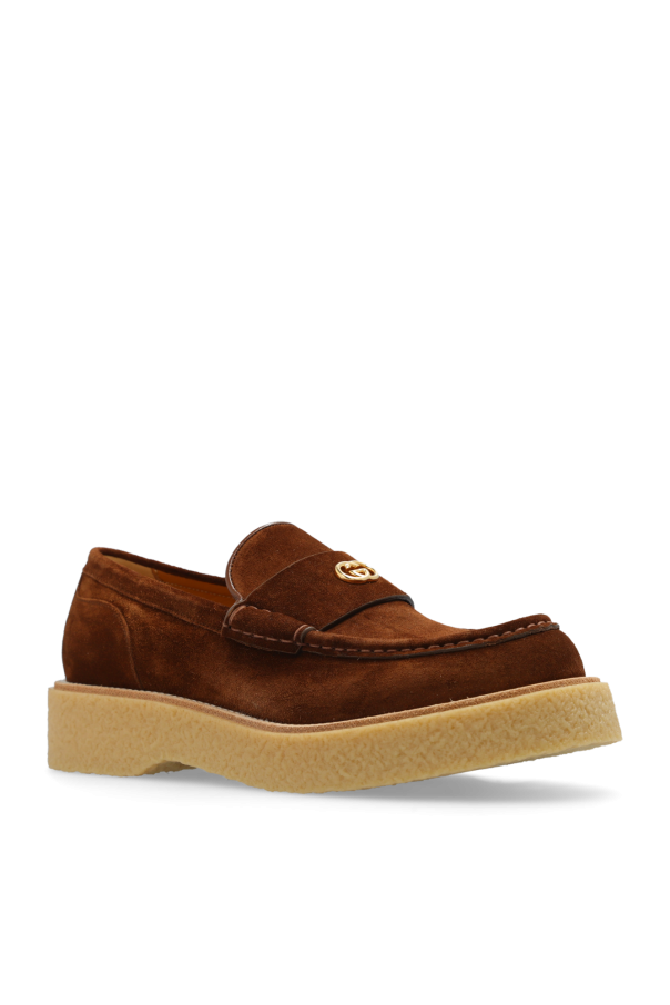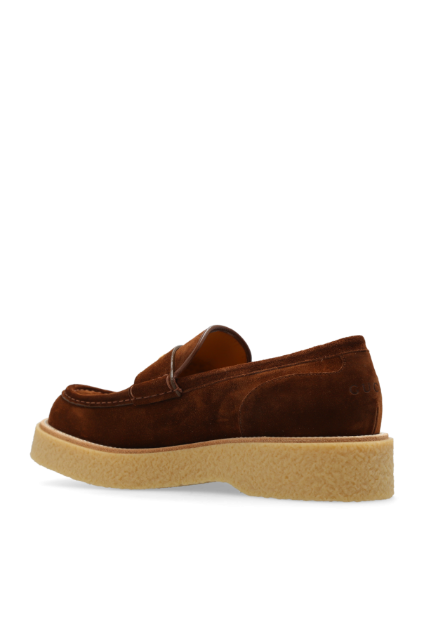 Brown loafers from Gucci. Made of suede, this pair sits on a beige rubber sole and is decorated with a gold-tone logo detail.