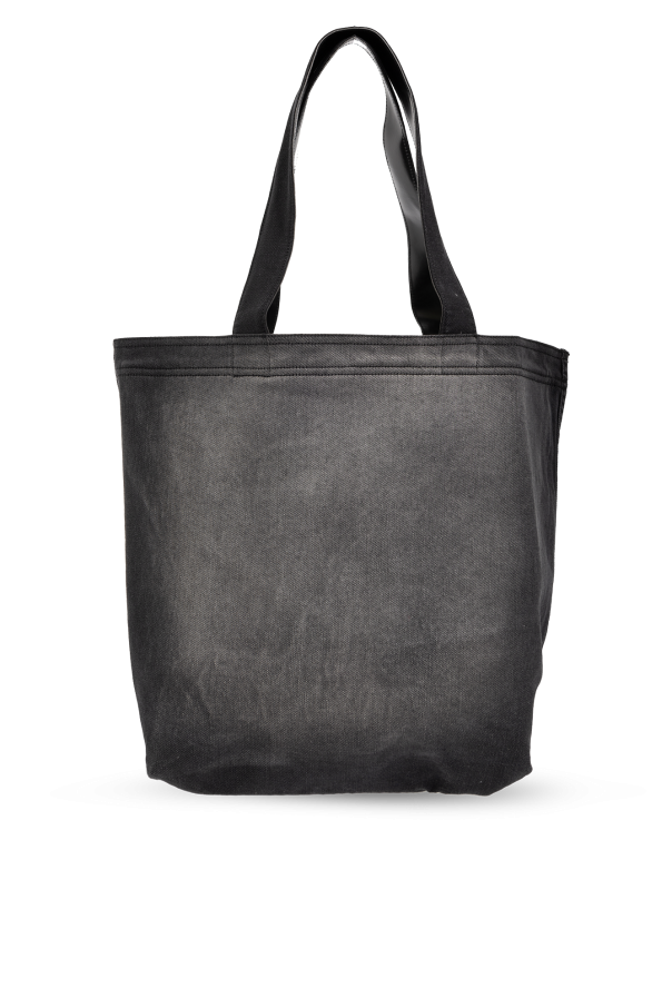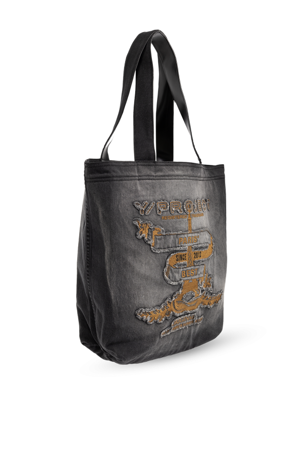 Black and grey denim shopper bag from Y Project. Decorated with a brown logo pattern and vintage effect, this model is complete with two half-round straps and one internal compartment.