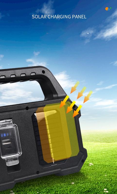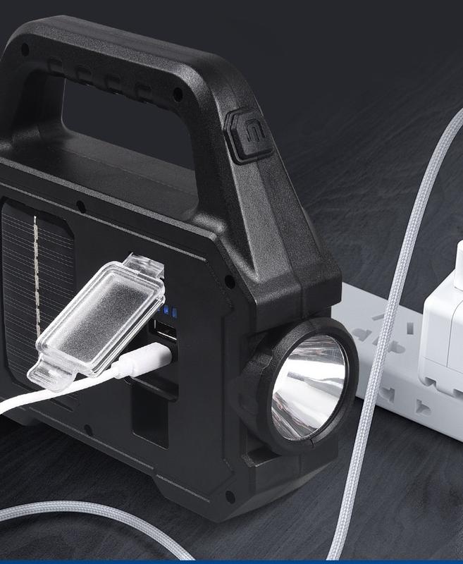 Очень компактный, легкий и многофункциональный фонарь для дома, дачи, рыбалки, охоты. Три режима свечения. Зарядка от USB кабеля или от солнечной батареи на задней стороне фонаря. USB порт можно использовать как Power Bank, для зарядки мобильных устройств. Основной свет – центральный мощный светодиод LED COB кристалл с фокусирующим отражателем белого цвета. Фонарь можно использовать как лампу для чтения, что дает светодиодный прямоугольник над основным светом. Переносной фонарик находится в ручке прожектора. Светодиод CREE в отражателе очень ярко светит и потребляет небольшую мощность. Может использоваться как портативный прожектор или лампа для палатки для кемпинга на открытом воздухе. Стильный внешний дизайн. Солнечная панель изготовлены из пластика и поликарбоната, имеют умную конструкцию, более удобные и практичные. USB-зарядка и солнечная энергия, USB-зарядка, поддержка ввода и вывода, подходит для путешествий, самостоятельного вождения и т.д. Его можно использовать как мобильный источник питания для аварийной зарядки мобильных телефонов. С ручкой его можно повесить где угодно и легко использовать. Область применения: подходит для наружного и аварийного использования, кемпинга, походов, ремонта автомобилей и т.д.