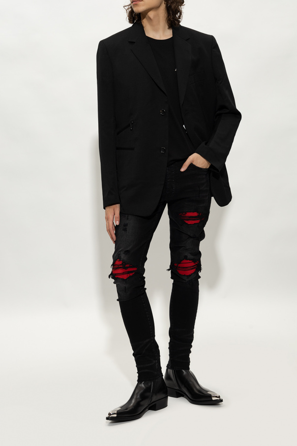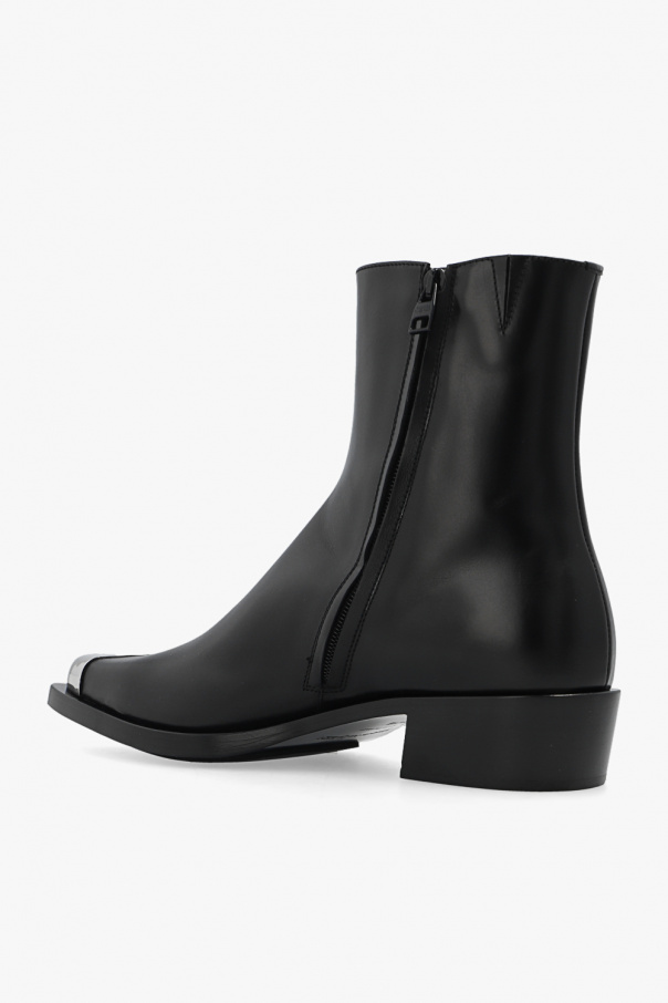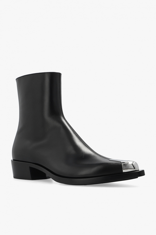 Black heeled ankle boots from Alexander McQueen. Crafted from calf leather, this model sits on a black leather sole with a rubber trim and features a pointed toe with silver-tone brass hardware.