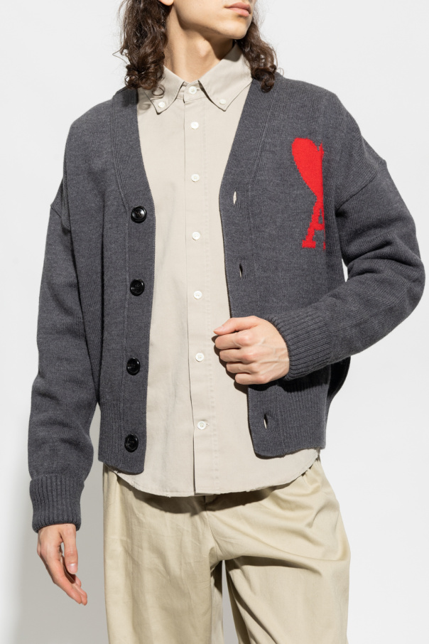 Grey cardigan from Ami Alexandre Mattiussi. Made of wool, this style showcases a red graphic pattern with the brand's logo, button closures and ribbed trims on the V-neck collar, bottom hem and cuffs.