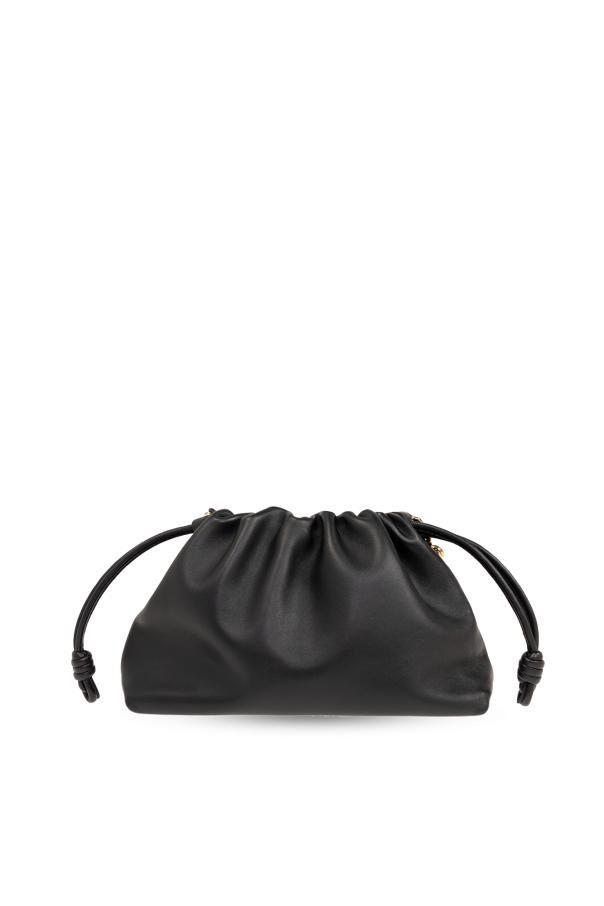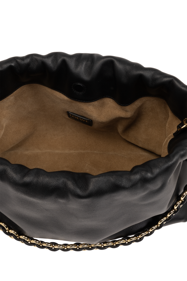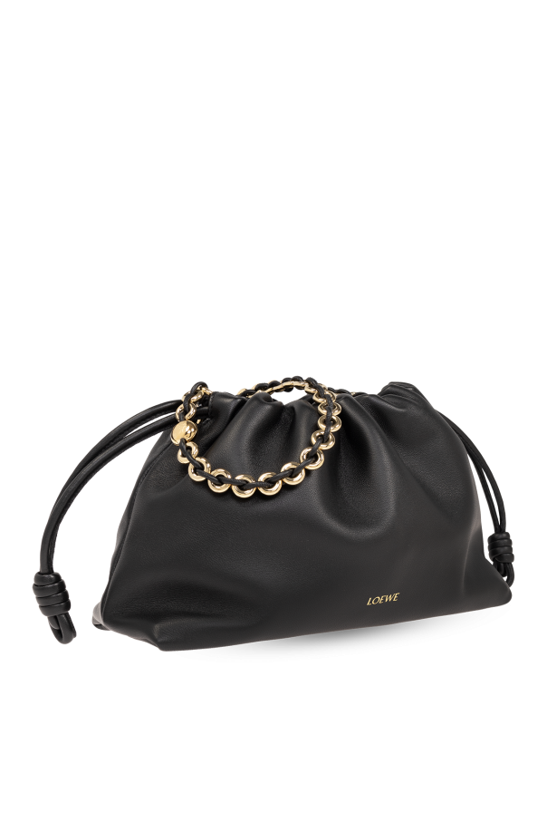 Black ‘Flamenco’ shoulder bag from Loewe. Made from lamb leather, this design cinches closed with drawstrings and showcases a printed logo on the front, a magnetic fastener, gold-tone metal hardware, one internal compartment as well as a detachable shoulder strap and a chain strap.