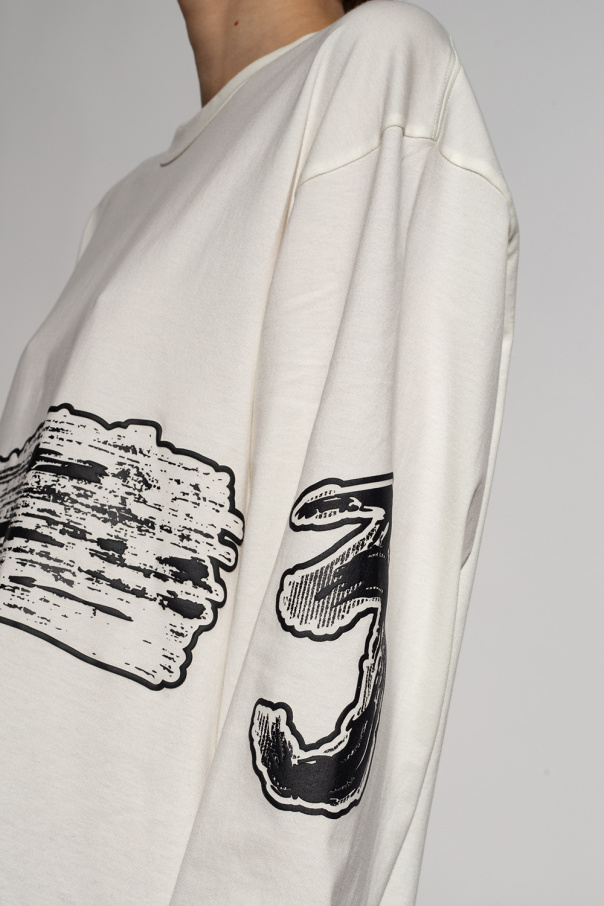 Cream crewneck T-shirt from Y-3 Yohji Yamamoto. Crafted from cotton with an oversize fit, this style features a graphic print on the front, rubberised black logo detailing on the shoulders and elasticized trims on the collar and long sleeves.