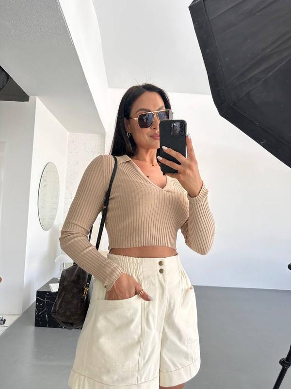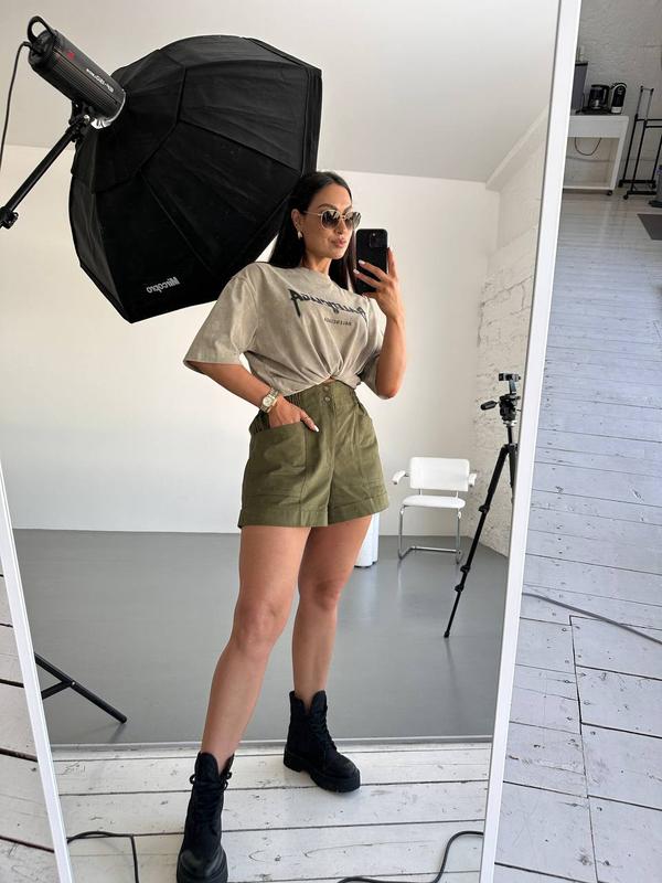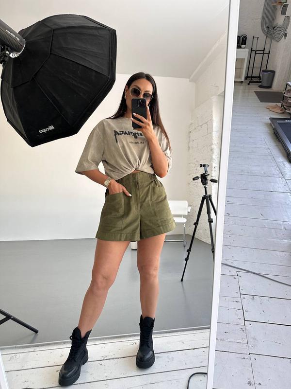 Цвет: кремовый,хакиДетали: высокая посадка, шероховатый пояс на резинке, глубокие карманы спереди и сзади, застежка – молния и кнопки. Шорты выполнены из натурального джинса, что делает их невероятно удобными и приятными к телу.