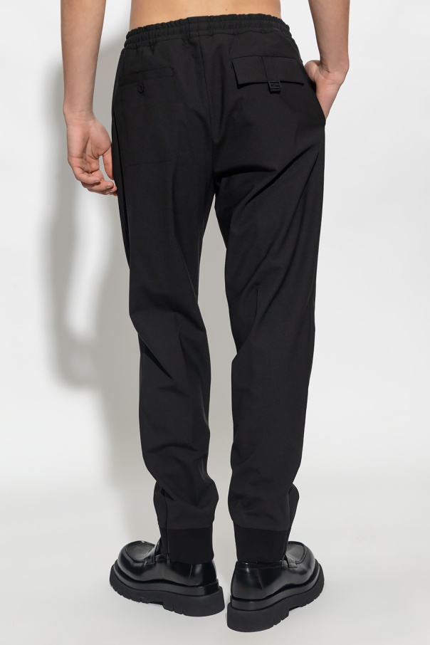 Black pleat-front trousers from Fendi. Crafted from a wool blend, this pair is complete with an elastic drawstring waistband, two front pockets, two back pockets – one with snap buttons and one snap-fastened flap pocket and tapered legs with zip details and ribbed cuffs.