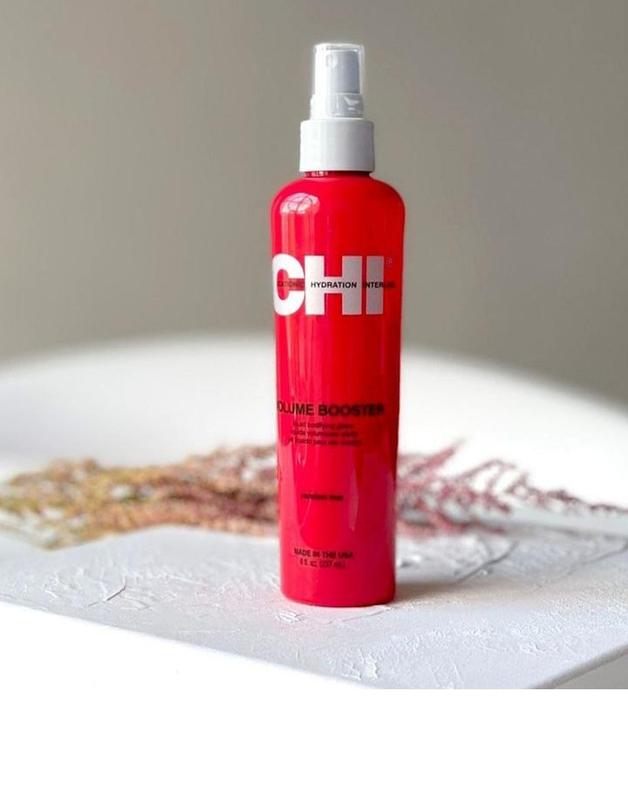CHI Volume Booster в виде спрея- распылителя , который удобно наносить, благодаря этой легкой формуле он не утяжеляет и не склеивает волосы, а фиксирует укладку и не дает прическе спадать в течение дня.