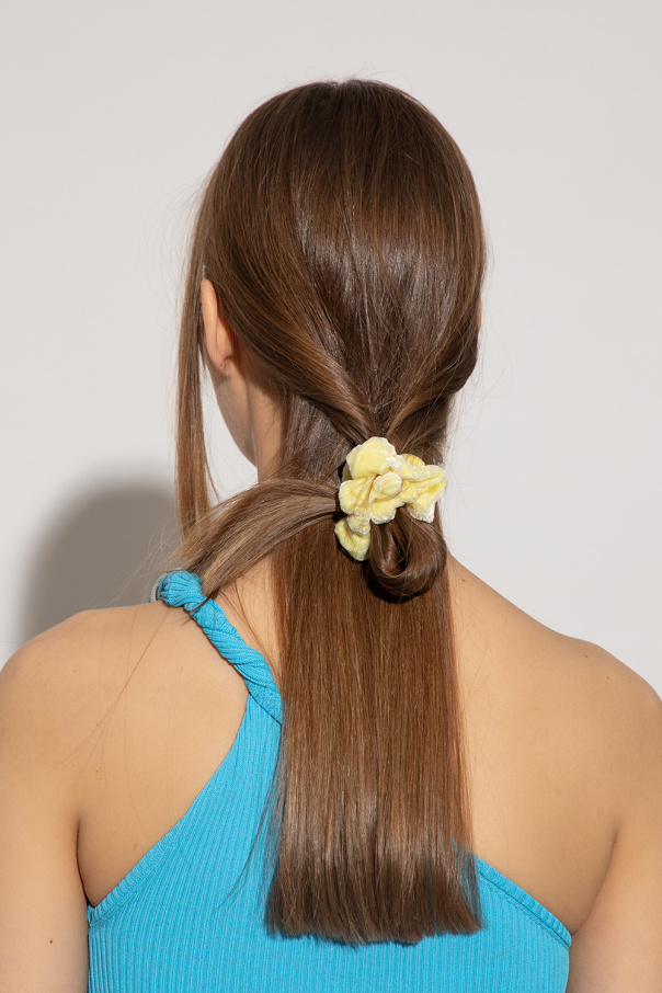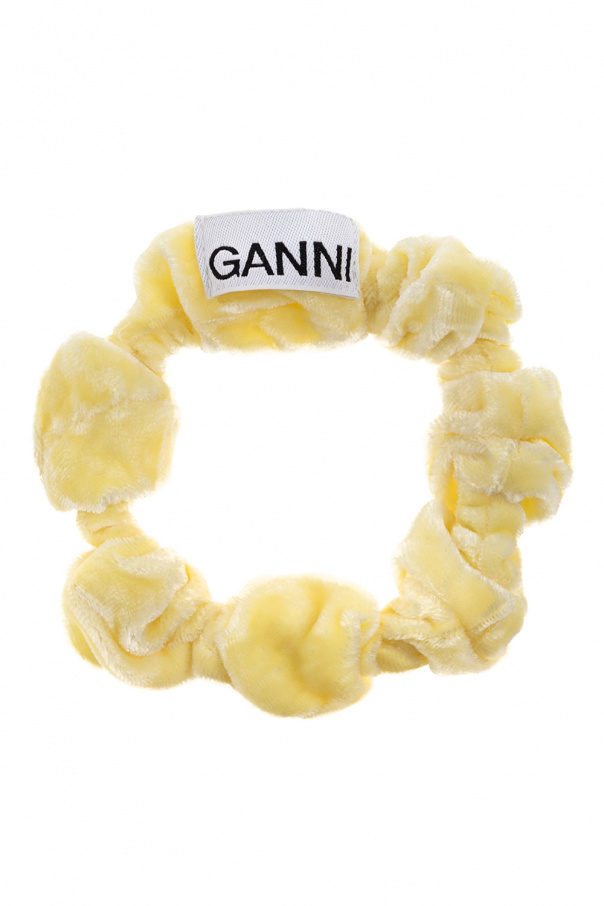 Yellow scrunchie from Ganni. Made of a silk blend with a velvet trim, this item features a logo patch.