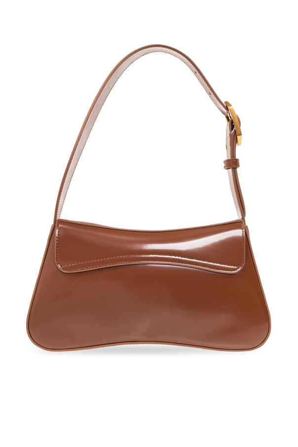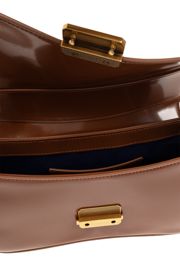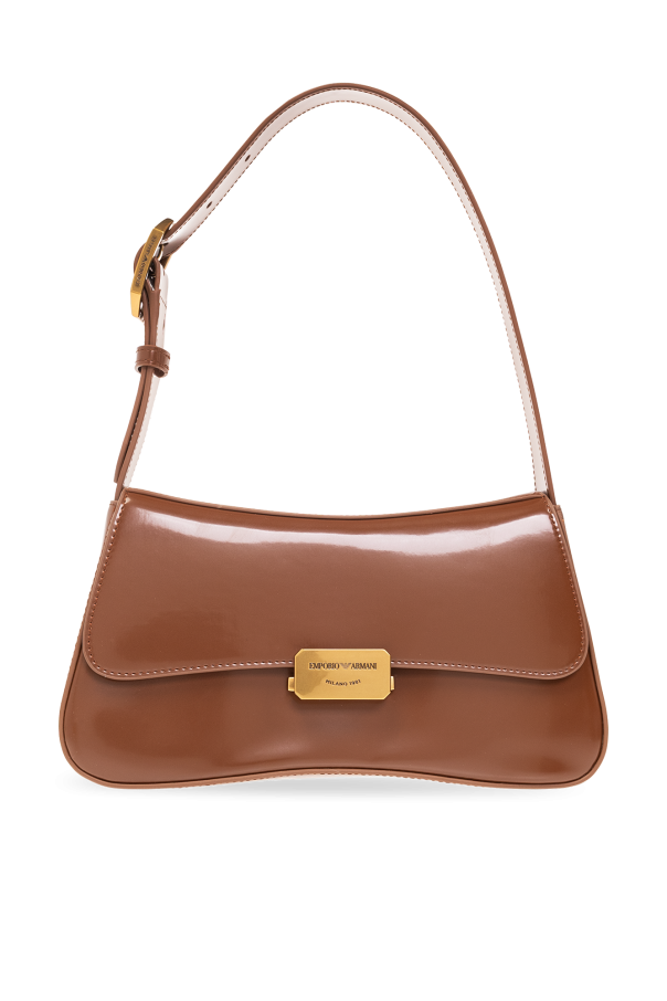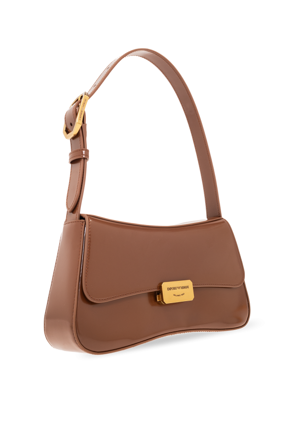 Brown shoulder bag from Emporio Armani. Made from faux leather, this design fastens with a logo-engraved snap and features an adjustable shoulder strap, antiqued gold-tone metal hardware and one internal compartment with a card slot.