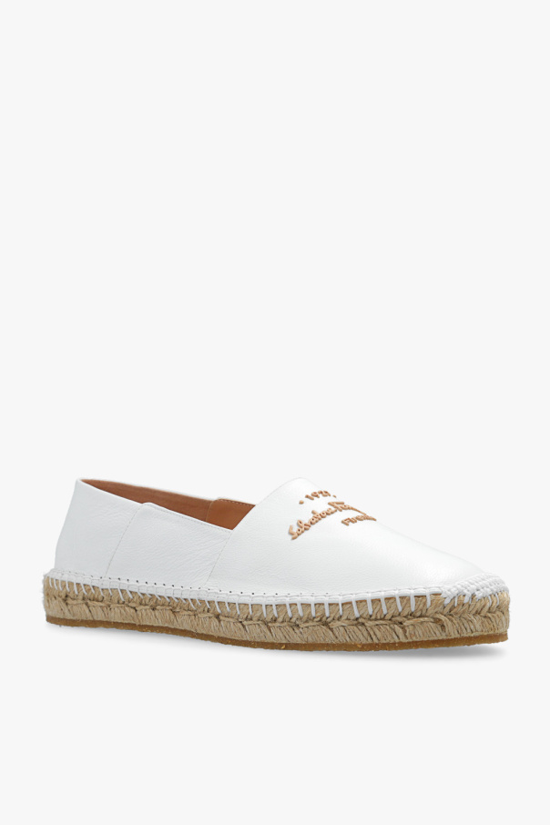 White ‘Susana’ espadrilles from FERRAGAMO. Made of leather, this model sits on a brown rubber sole and showcases a raised logo in beige on the front.