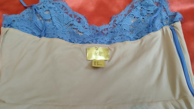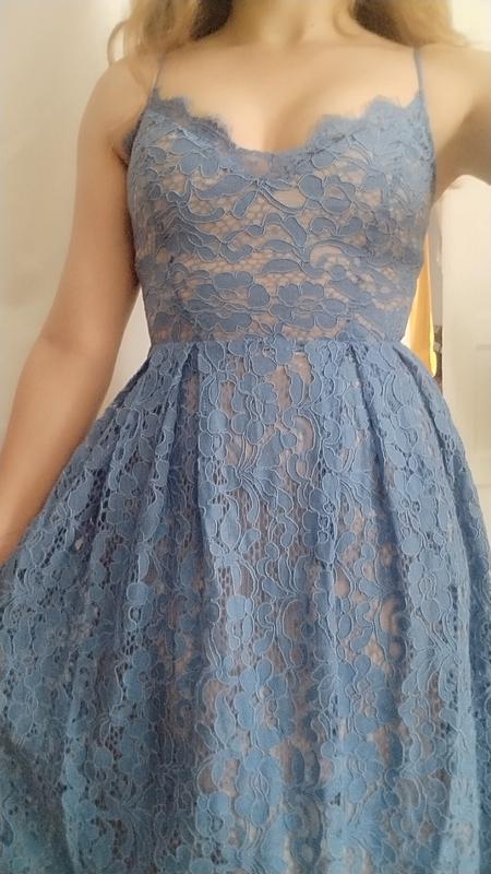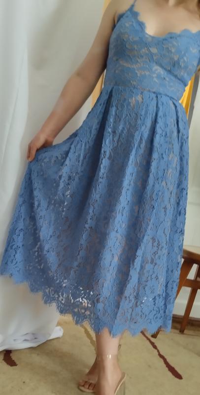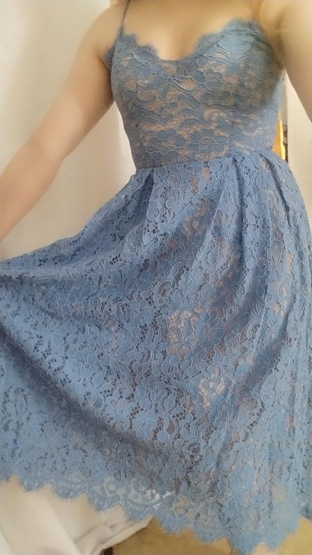 Голубое кружевное платье-сарафан с бежевым, прохладным, приятным к телу подкладкой, на регулирующих бретелях, прилегающий к талии фасон подчеркивает красоту бюста