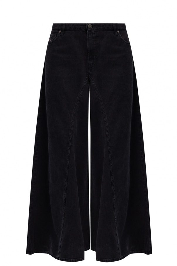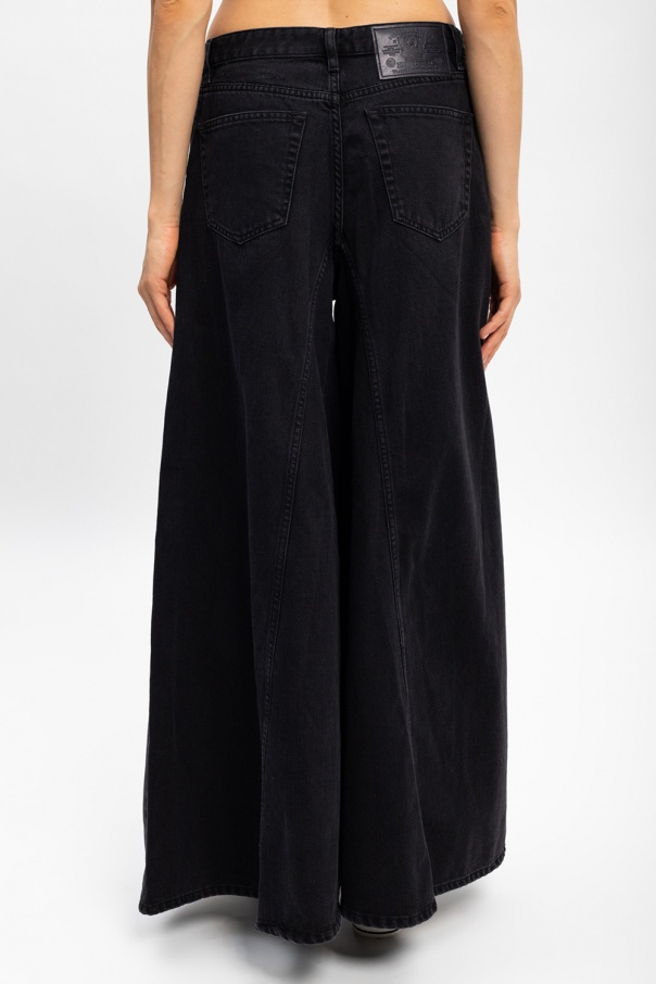 Black ‘D-Spritzz’ jeans from Diesel. Fastened with a zip and button, this flared wide leg design features a logo appliqué as well as two front and two rear pockets.
