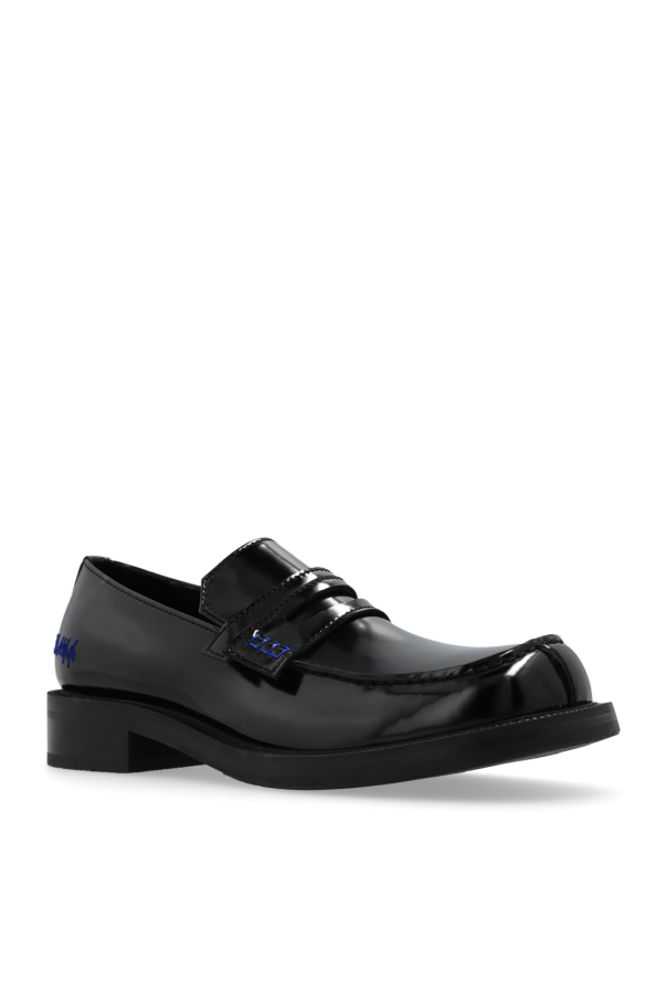 Introducing the quintessence of refined sophistication - the Leather Loafers by Ader Error. Crafted with meticulous attention to detail, these loafers encapsulate the harmonious blend of classic allure and contemporary finesse. The dominant black hue lends these shoes a versatile and timeless character, making them an indispensable addition to the discerning gentleman\'s wardrobe. The exterior boasts a smooth, glossy finish, indicative of high-quality patent leather, while the interior, also in black with subtle blue accents, speaks volumes of the craftsmanship invested into every stitch. The loafers feature a traditional rounded toe, a low heel, and a flat sole for unmatched comfort and elegance. The wide strap across the vamp, adorned with discreet blue details, possibly a brand\'s logo, adds a distinctive touch that sets these loafers apart. Why Purchase This Product? Exquisite Craftsmanship: Precision stitching and high-quality materials reflect the luxury expected of the Ader Error brand. Timeless Design: The classic black color and polished finish ensure these loafers remain a fashionable choice for years to come. Detailed Accents: Unique blue embellishments on the strap add a subtle hint of color and exclusivity. Versatility: Perfect for formal occasions or adding a touch of sophistication to casual wear.