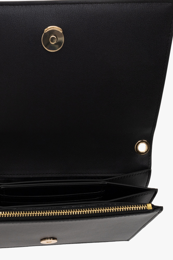 Black wallet from Versace Jeans Couture. Crafted from faux leather, this design features a magnetic snap closure, raised logo, the brand\'s signature pattern in yellow, brown and black, back pocket, detachable shoulder chain and gold-tone metal hardware. It has two separate internal compartments, zipped coin pocket and four card slots inside.