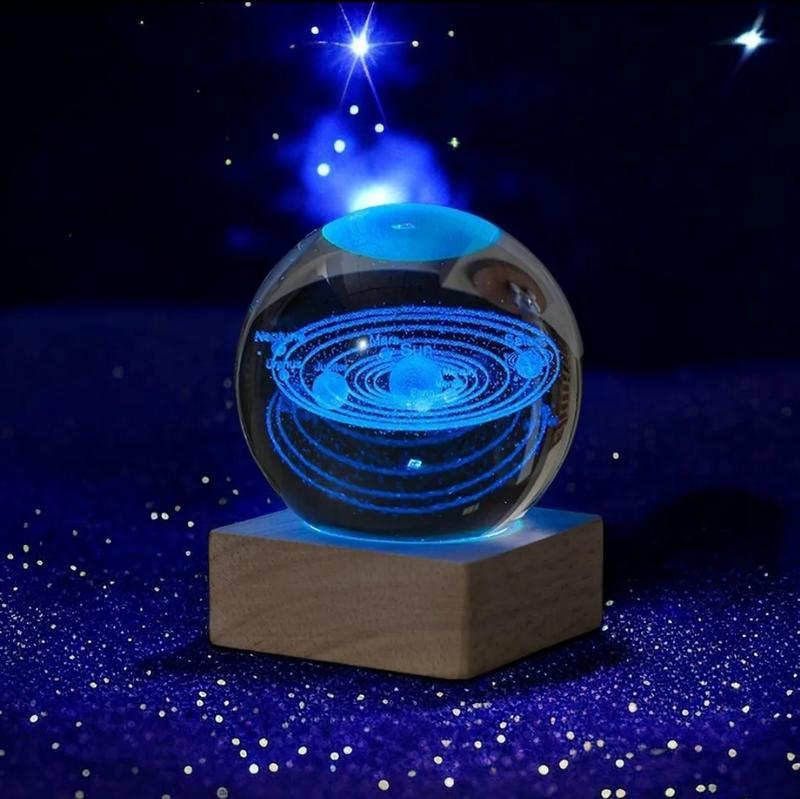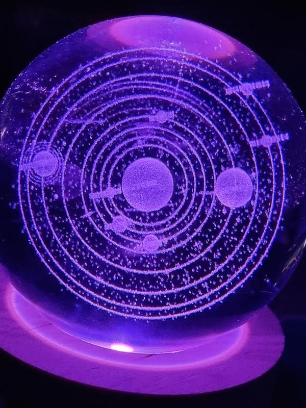 Кристальная Куля" выполнена из экологичных материалов - дерева и стекла. Внутри стеклянного шара нанесена лазерная гравировка в виде Солнечной системы. Подставка является круглая и квадратная. По умолчанию отправляю квадратную, как на фото 1. Плавно меняет цвета подсветки.