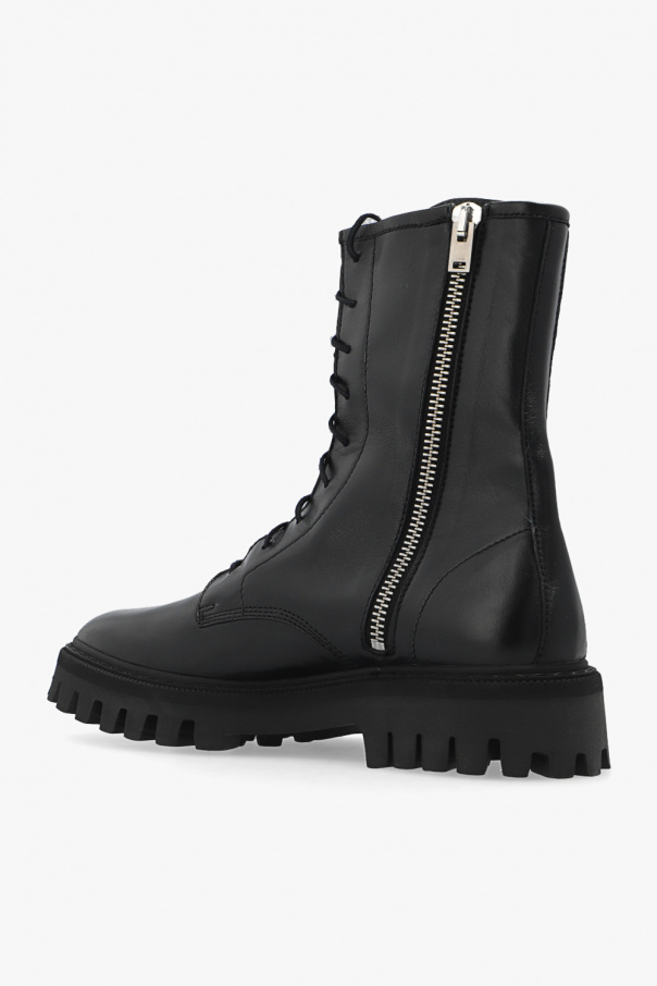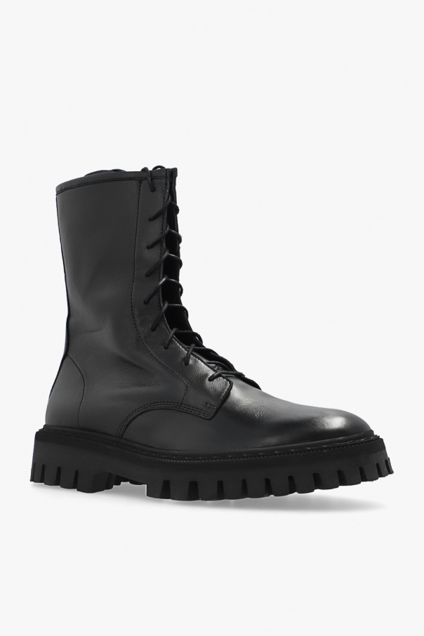 Black combat boots from Iro. Crafted from lamb leather, this lace-up model sits on a black rubber sole and features a round toe and a side zipper.