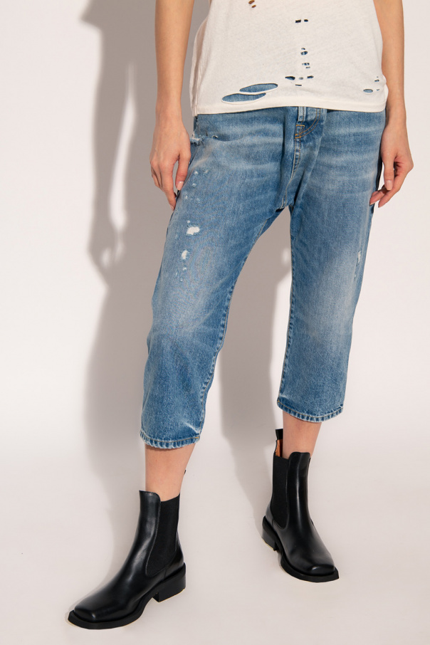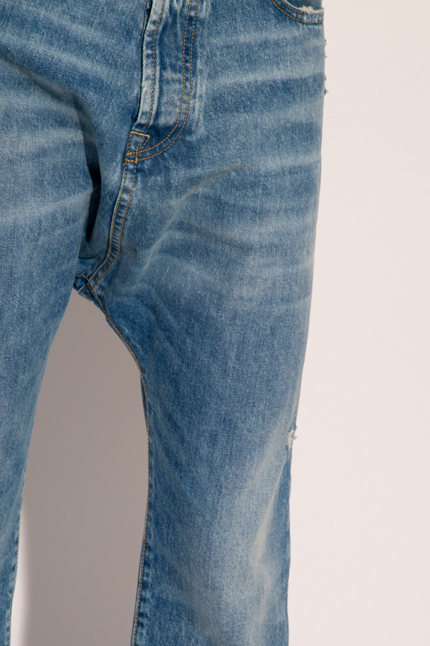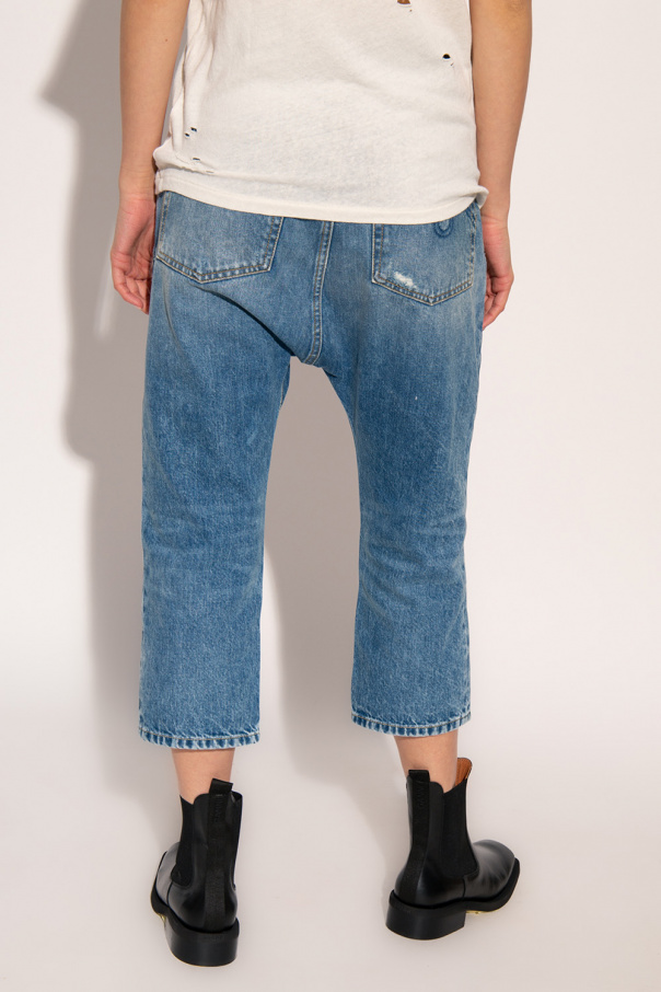 Blue jeans from R13. Made of cotton with a dropped crotch, this pair features button fastenings, classic five pockets, distressed detailing, a black logo patch and three-quarter length legs.