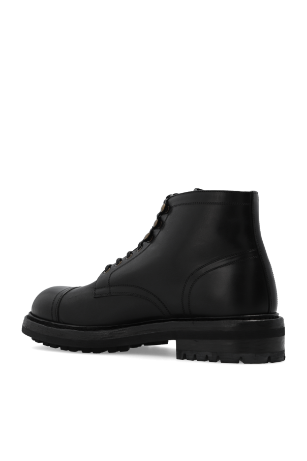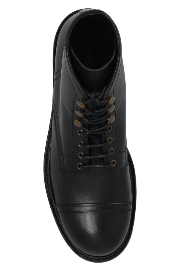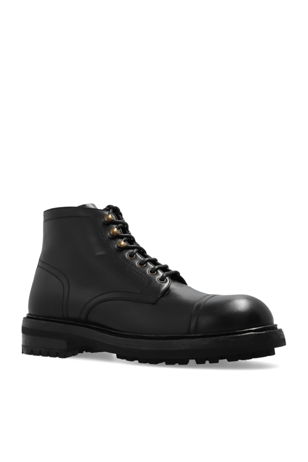 Black boots from Dolce & Gabbana. Made of leather, this lace-up pair features decorative stitching, antique gold-tone metal hardware and black rubber sole.