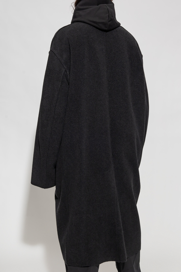 Dark grey coat from Balenciaga. Crafted from cashmere with an oversize, double-breasted silhouette, this style features button fastenings, a collar with peak lapels, one slip pocket, two flapped pockets, long sleeves and a single back vent.