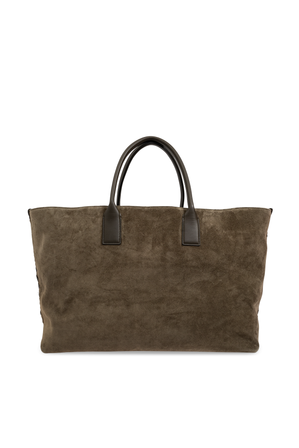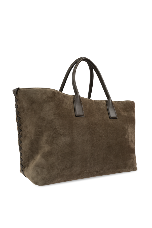 Presenting the Cabat Large shopper bag from the exclusive fashion house, Bottega Veneta. This meticulously crafted accessory epitomizes understated sophistication and timeless elegance. Characterized by its rectangular silhouette with gently rounded corners, the Cabat Large features dual short handles, allowing for effortless carrying by hand. The body of the bag is fashioned from a premium, suede-like material, offering a soft yet durable touch. Contrasting smoothly against this texture, the handles are made from sleek leather, adding a touch of refined luxury. This shopper bag boasts a rich, dark green hue, enhancing its classic and subdued aesthetic. Its minimalist design is accentuated by a seamless, pattern-free exterior, while the sides reveal a distinctive woven finish. A discreet designer logo adorns the front, near the lower edge, subtly affirming its prestigious origin. The interior of the Cabat Large is spacious and lined with the same sumptuous material found on the exterior. Inside, you\'ll find a zippered pocket for secure storage, complemented by two slip pockets for additional organization. The handles are securely stitched, ensuring lasting durability and comfortable wear. Why Choose This Product? Timeless, minimalist design High-quality, suede-like material Elegant dark green color Spacious interior with multiple pockets Discreet and sophisticated designer logo