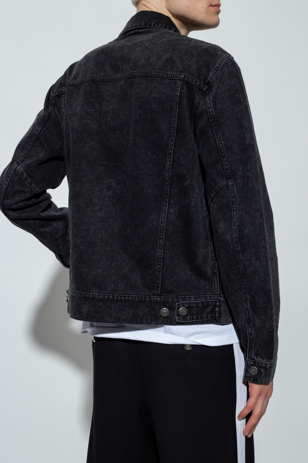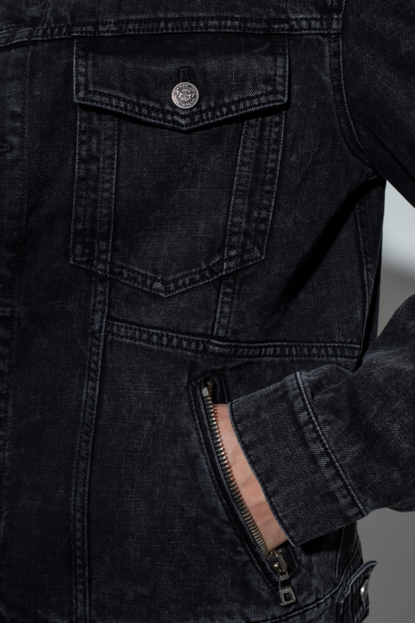 Black denim jacket from Balmain. Fastened with logo-embossed buttons, this style features long sleeves and two zipped pockets and two snap-fastened flap pockets on the front.