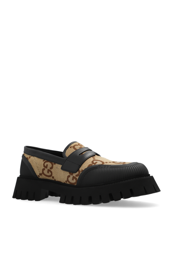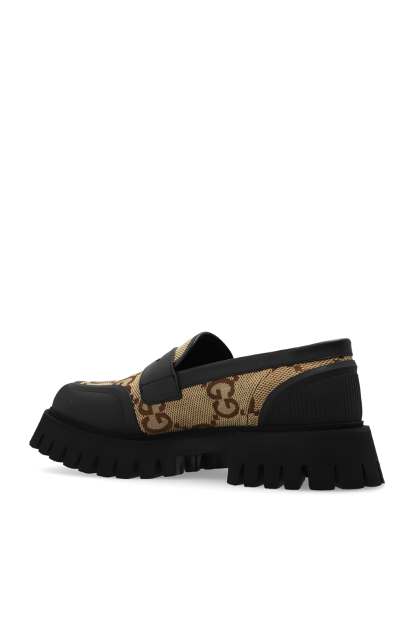 Black, beige and brown loafers from Gucci. Made of ‘Maxi GG’ canvas trimmed with rubber and leather, this pair features a logo, monogram pattern and black EVA sole.