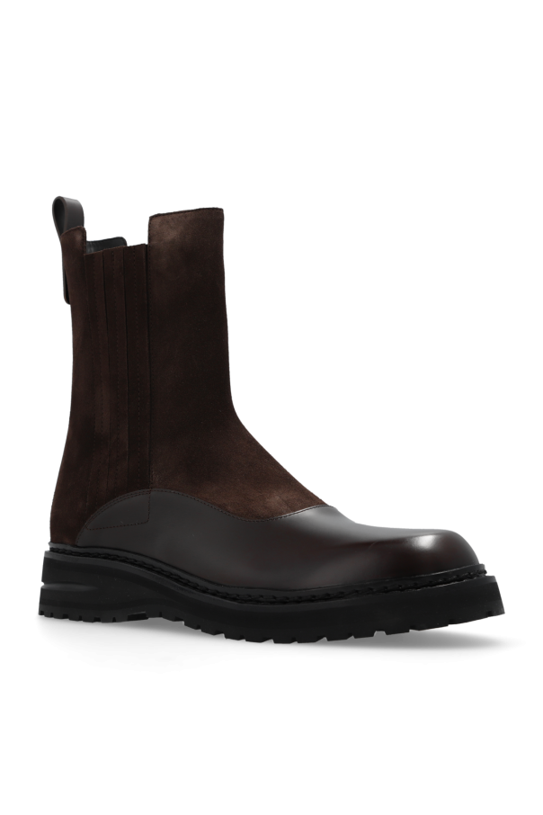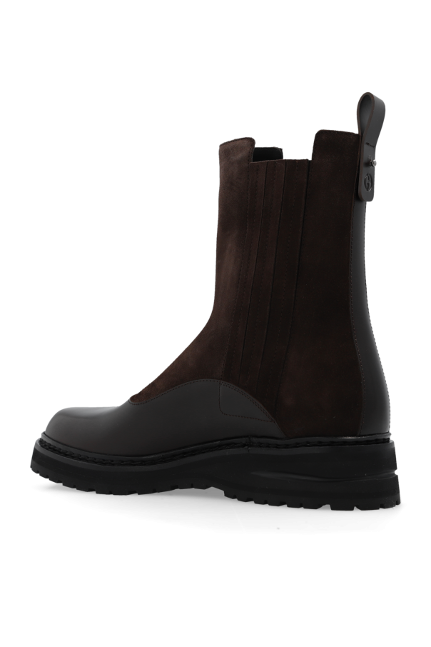 Brown ankle boots from Giorgio Armani. Made from leather, this model sits on a black rubber sole and features an almond-shaped toe and elastic panels on the sides.