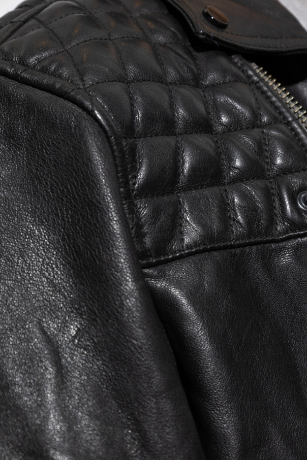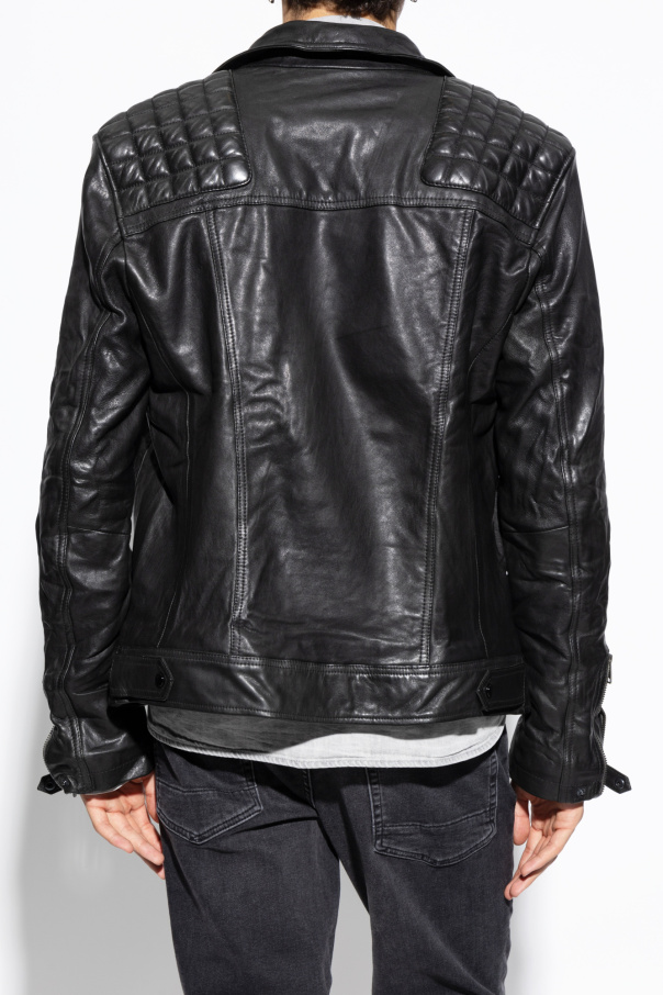 Introducing the Conroy Leather Jacket by AllSaints, an epitome of refined elegance and rugged charm. Crafted from premium sheepskin leather, this jacket boasts a classic motorcycle silhouette with an asymmetrical front zipper, designed to accentuate the contours of your physique. The Conroy features distinctive quilted panels on the shoulders and upper back, adding a bold statement to its aesthetic. With two side pockets secured by zippers and adjustable straps at the cuffs, this jacket offers both functionality and a perfect fit. Adorned with striking silver-toned metal zippers and a snap closure on the collar, this jacket exudes a raw, industrial edge. The intricate stitching highlights its meticulous craftsmanship, ensuring durability and an elegant finish. Why Choose This Product? High-Quality Material: Made from 100% sheepskin leather for a luxurious feel and long-lasting wear. Unique Design: Quilted inserts and asymmetrical zipper for a distinctive, modern look. Functional Details: Metal zippers and adjustable cuffs for added utility and style. Timeless Elegance: A sophisticated piece that seamlessly blends ruggedness with class.