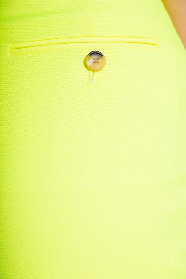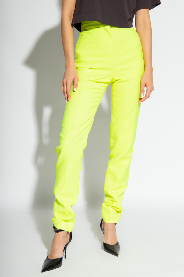 Neon yellow pleat-front trousers from Alexander McQueen. Crafted from wool with a high-rise waist, this pair falls with slightly tapered legs and features a zip fly with a button and a hook, two side seam pockets and one back button pocket.