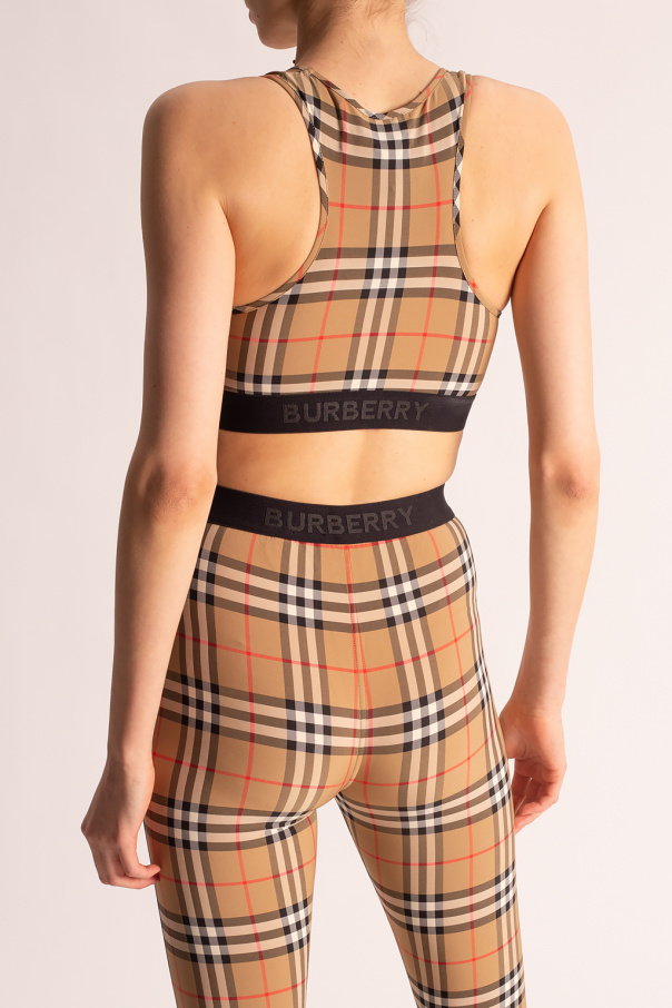 Brown, black and red cropped top from Burberry. Enriched by the signature ‘House Check’ pattern, this style features a black underband with the brand\'s logo.