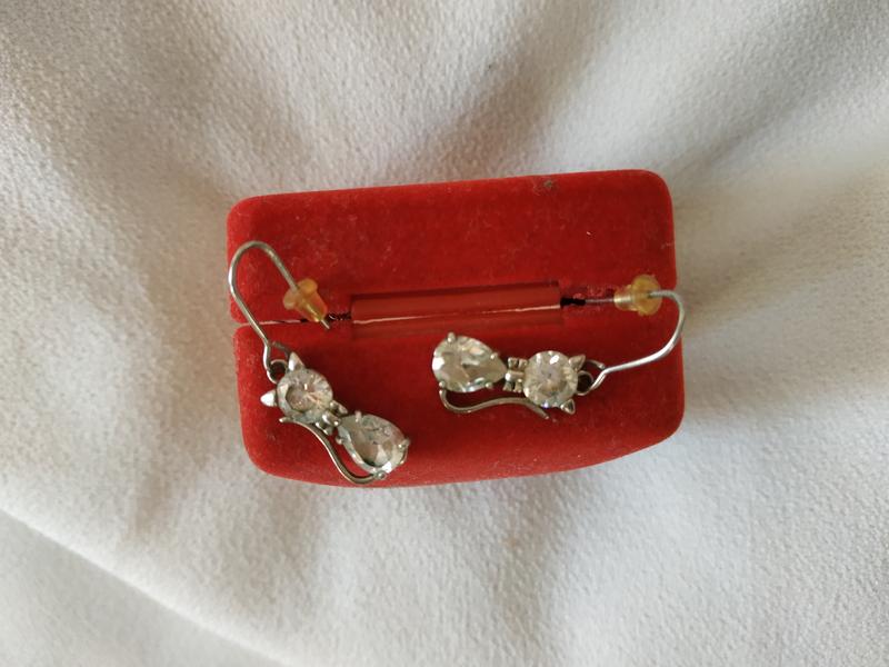 Сережки Кошки каплеобразной формы с белыми прозрачными камнями "под фианит". Высота 1,5 см, длина дужечки тоже 1,5, целиком высота серёжек 3 см. Камни стилизованы под кошачий силуэт. Смотрятся очень мило. Одевались пару раз, в отличном состоянии.