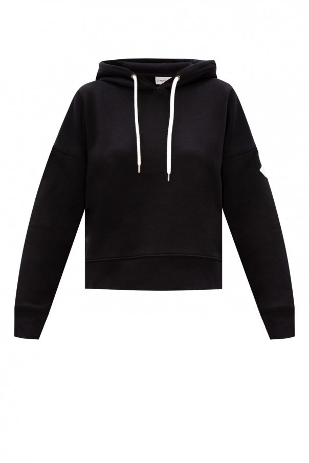 Black hoodie from Moncler. Crafted from cotton, this style comes with the label\'s logo printed in white on the back, long sleeves, one of which has white logo patch and white cinching drawstrings to the hood.