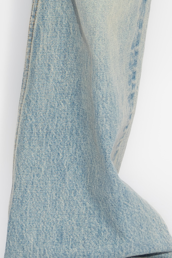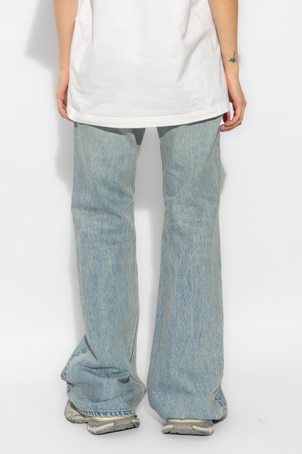Light blue jeans from Balenciaga. Falling with flared legs, this pair features a zip fly with a button, classic five-slip pockets and a brown logo patch on the back.