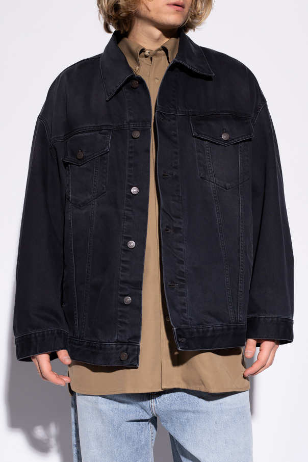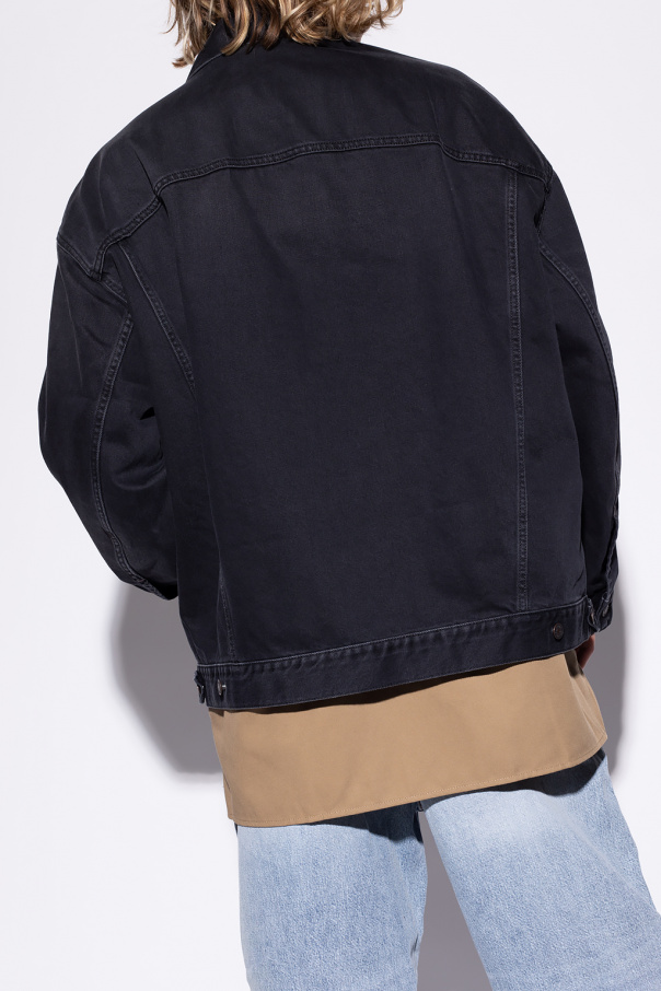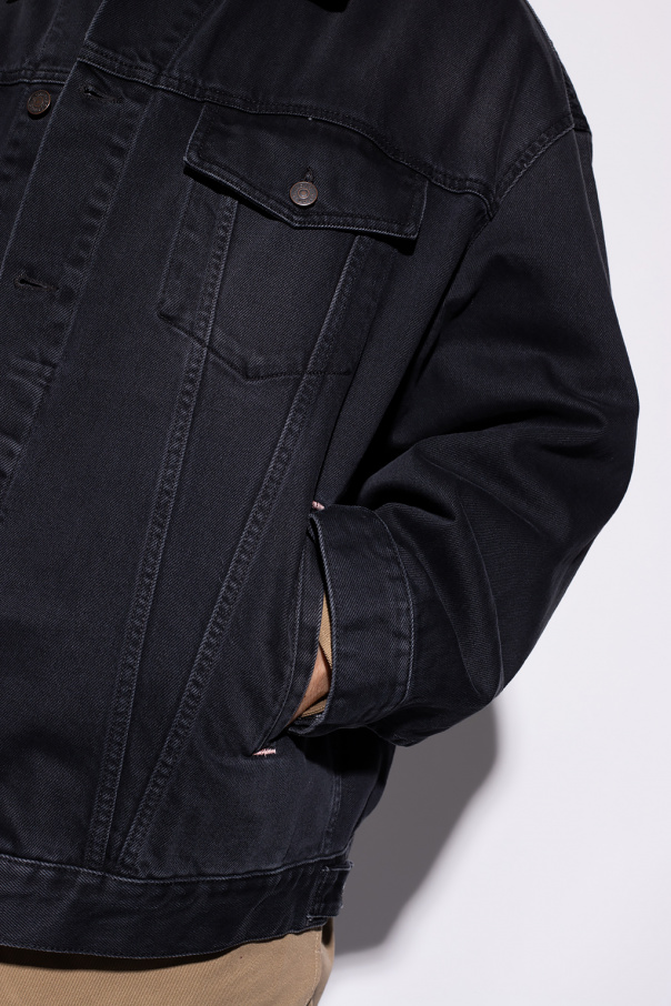 Black denim jacket from Acne Studios. Crafted from cotton, this style fastens via buttons and showcases distinctive pink stitching, two slip pockets, two flapped pockets and long sleeves with button cuffs.
