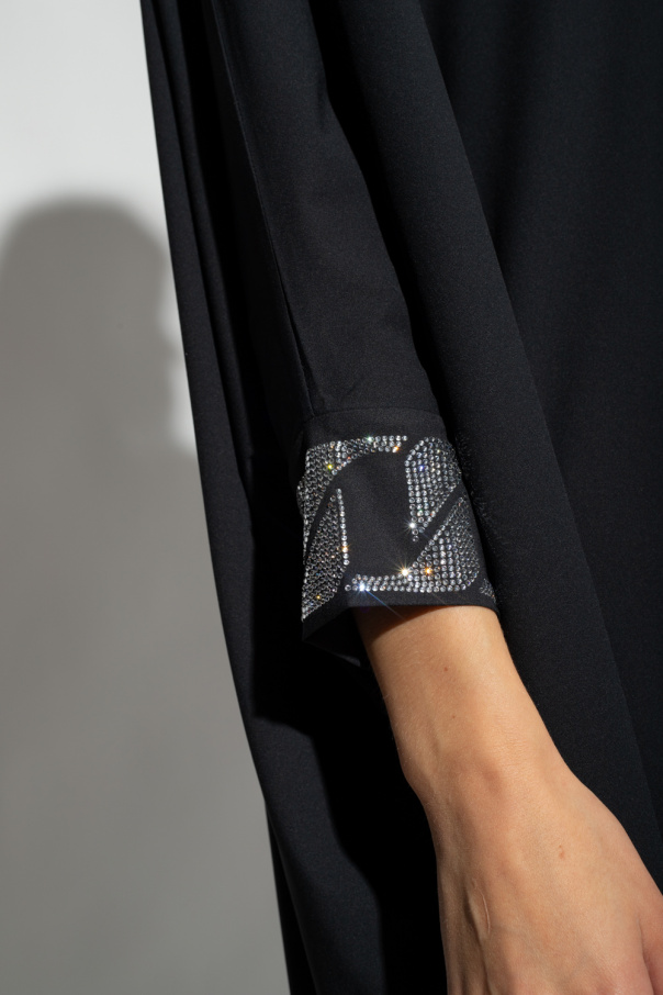 Black beach dress from Balmain. Cut with an oversize silhouette, this style features a V-neckline, high slits on the sides and sleeves with elasticated cuffs accentuated with glossy chain appliqués.