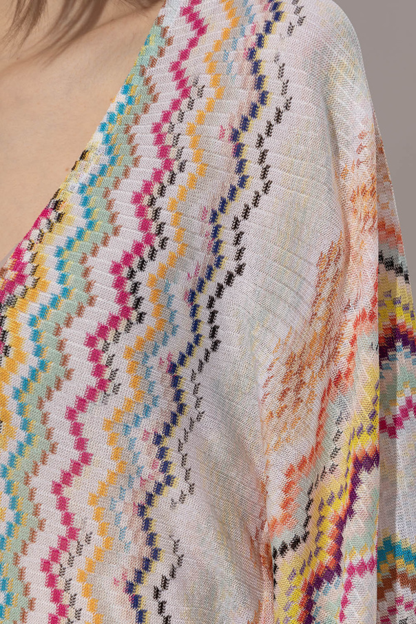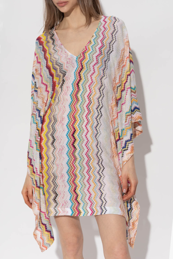 Multicolored mini beach dress from Missoni. This design features the brand’s signature zig zag motif, this loose-fitting design features a V-neck, short sleeves and asymmetrical hem.