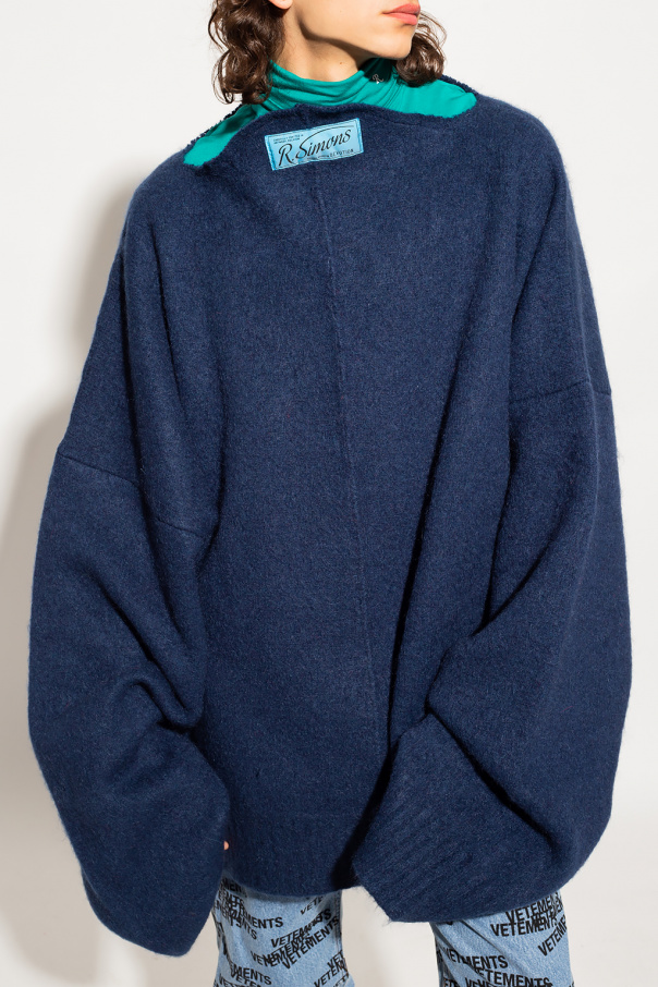 Navy sweater from Raf Simons. Made of a wool and mohair blend, this oversize garment features a decorative high neck, blue and black logo patch, long wide sleeves and ribbed trims.
