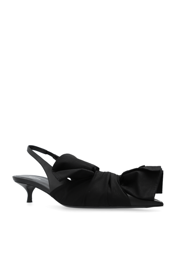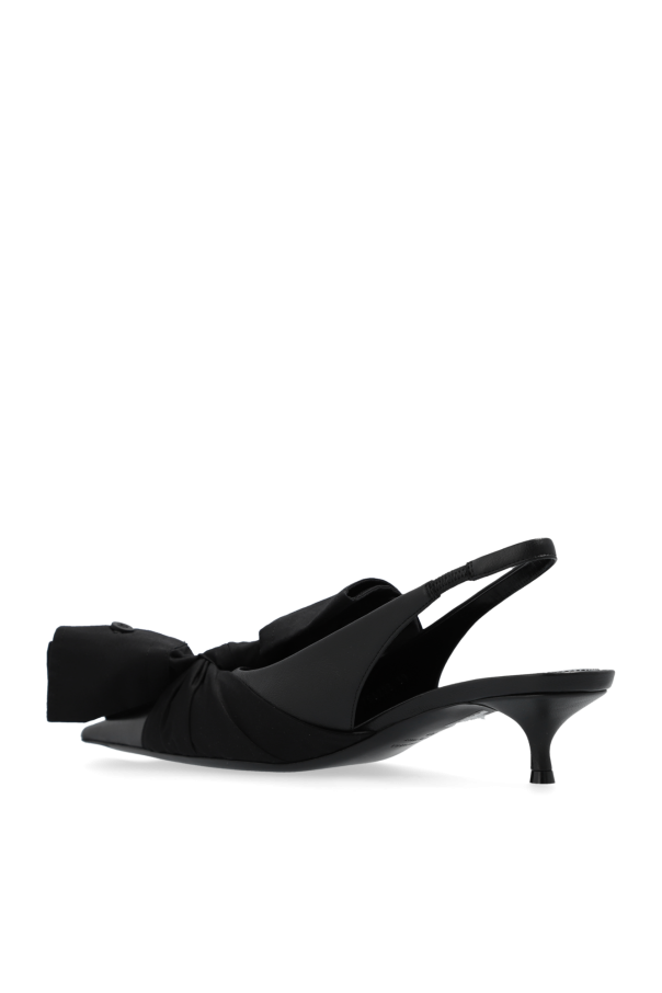 Introducing the ‘Knife Chemise’ Heels by Balenciaga, a testament to avant-garde elegance and a modern reinterpretation of classic sophistication. Crafted from the finest lamb leather and cotton, these heels embody the fusion of luxury and innovative design. The dominant black hue exudes timeless grace, while the sleek, pointed toe silhouette presents an edgy yet refined aesthetic. The front of the shoe is adorned with a large, decorative bow, featuring a unique cuff motif that adds an element of refined sophistication. The ‘Knife Chemise’ heels are designed with a slender, ‘kitten heel’ that marries elegance with comfort, making them suitable for extended wear. A discreet designer logo, possibly adorning the bow, hints at the exclusivity of these heels. The open-heel construction with a mid-foot strap ensures a stable and secure fit, enhancing the shoe\'s functionality without compromising its stylish allure. The outer, inner, and sole layers are meticulously crafted from leather, promising durability and a luxurious feel with every step. These heels are not just footwear; they are a statement of unparalleled craftsmanship and distinctive style. Why Purchase the ‘Knife Chemise’ Heels? Exquisite craftsmanship from high-quality lamb leather and cotton. Elegant design with a modern twist, featuring a pointed toe and decorative bow. Comfortable yet stylish ‘kitten heel’ suitable for all-day wear. Signature Balenciaga design with discreet logo detailing. Open-heel construction with strap for enhanced fit and stability.