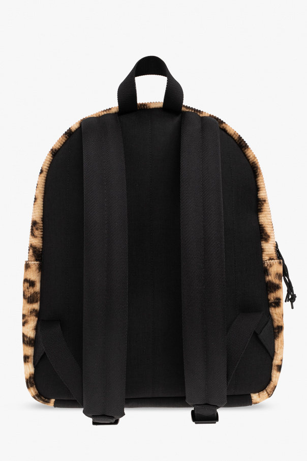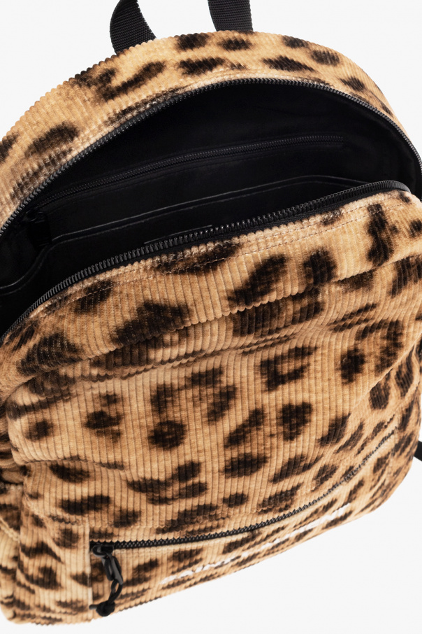 Beige and black ‘Nuxx’ backpack from Saint Laurent. Cut from corduroy, this item fastens with a two-way zip and is decorated with an animal pattern and white logo embroidery. It is complete with a front zip pocket, side pockets, half-round handle, adjustable shoulder straps, black metal hardware and one internal compartment with one zip pocket and one slip pocket.