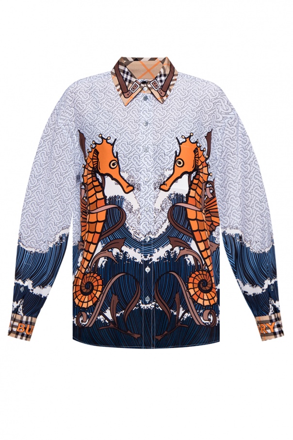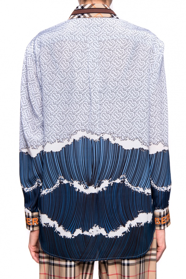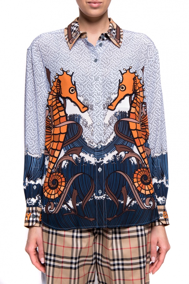 Blue shirt from Burberry. Made of silk. Fastened with buttons. Decorated with a printed pattern. The brand’s signature check pattern printed at the collar and cuffs. Slip pocket on the front.