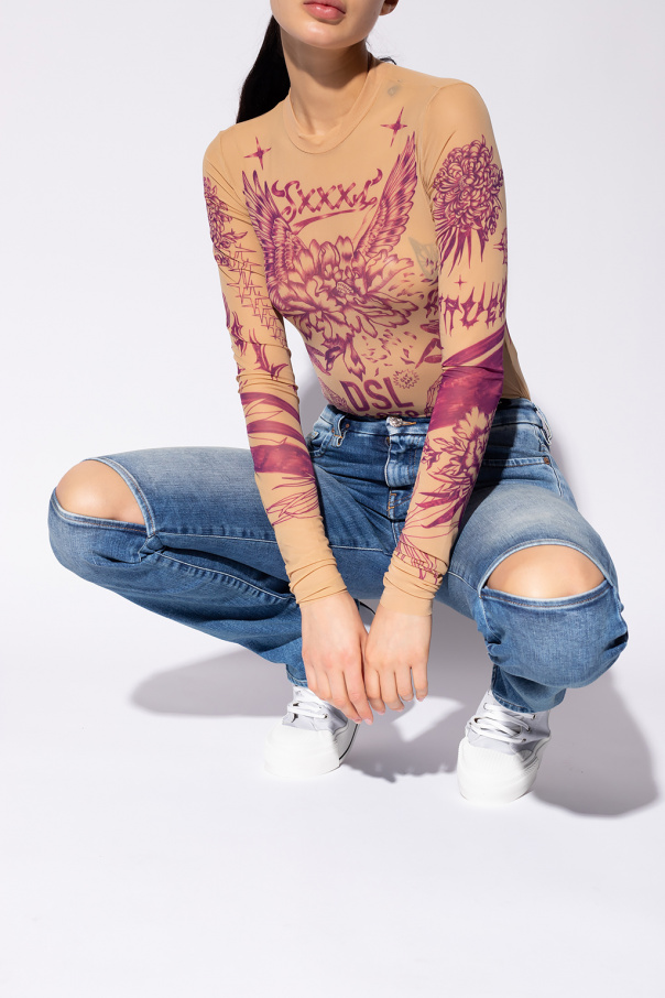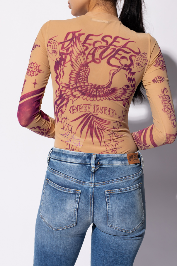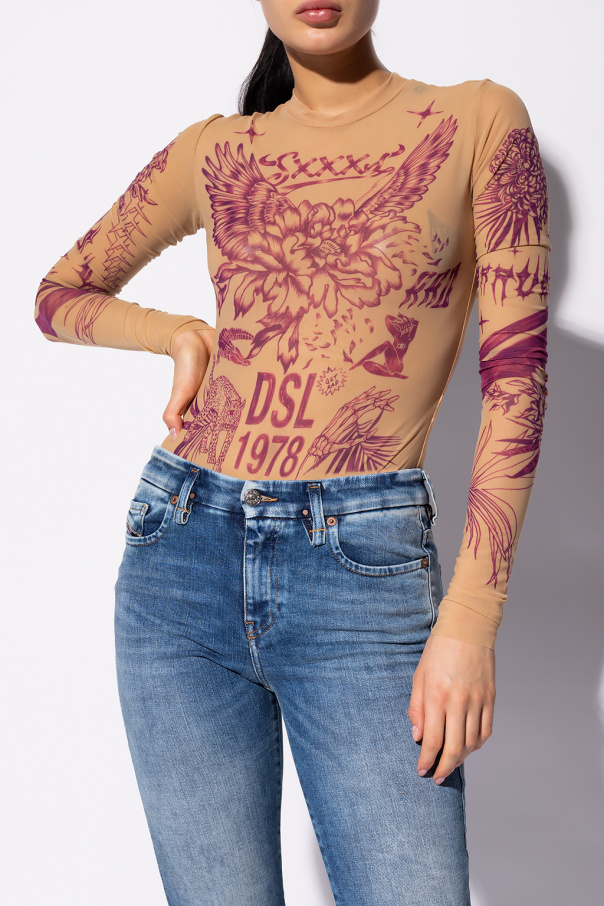 Beige transparent body from Diesel. Fastened with snaps, this long-sleeve design is decorated with a printed logo pattern in purple.