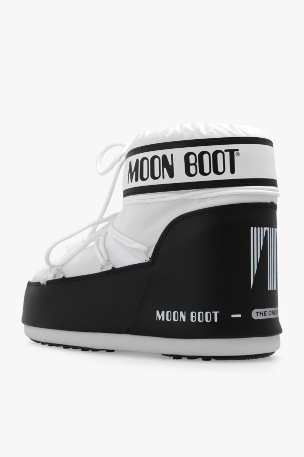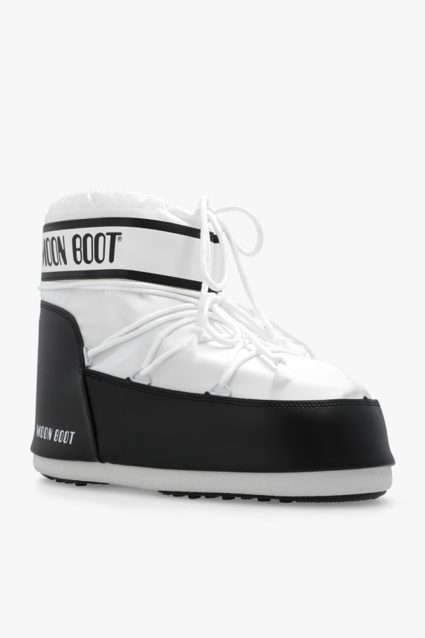 White and black ‘Icon Low’ insulated snow boots from Moon Boot. Crafted from water-repellent ProTECHt material, this lace-up model showcases the brand's logo, a lightweight midsole and suction pads on the rubber tread sole that offer serious ground control. Inspired by the footwear worn by astronauts during the 1969 lunar landing, this project combines technical features with a contemporary look.