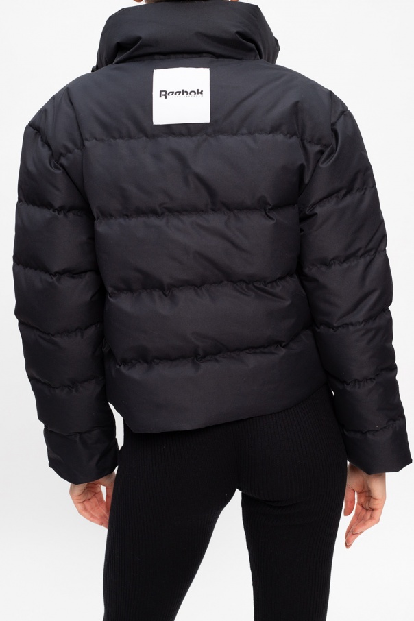 Black quilted jacket from Reebok x Victoria Beckham. Boasting a white and black logo patch on the back, this puffer fastens via zip and employs two zipped pockets on the front, cinching drawcords at the hem and long sleeves with elasticated cuffs.
