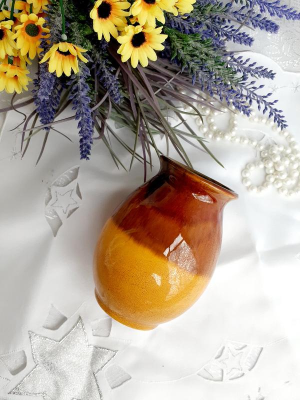Оригинальная небольшая вазочка, очень милая и необычная, как и все изделия, выпущенные ограниченным тиражом Васильковским майоликовым заводом в 1960-х годах. Украинская самобытность! Магия, проходящая через призму ностальгии! Данный экземпляр - винтаж, прекрасный образец обливной керамики, - обожженная глина покрыта карамельной глазурью (майолика)! Глазурь имеет благородную сеточку кракелюра, подтверждающего серьёзный винтажный возраст изделия. Автор формы Михаил Иванович Денисенко, который внедрил новые технологии гончарного производства в Украине, возглавил школу высокого гончарного искусства, благодаря которому прослеживается тесная связь между прадавней культурой и сегодняшним днем!