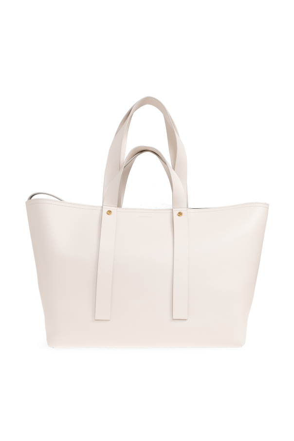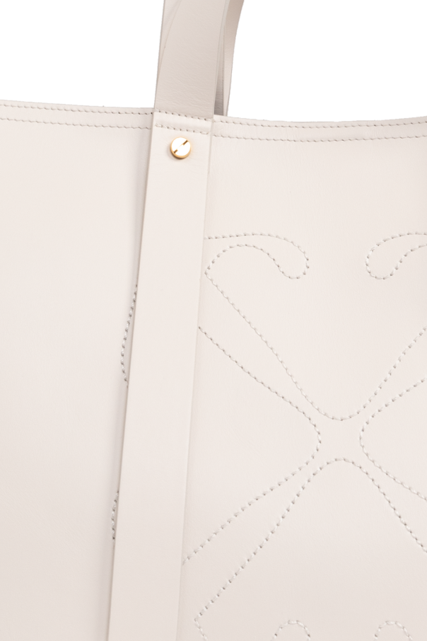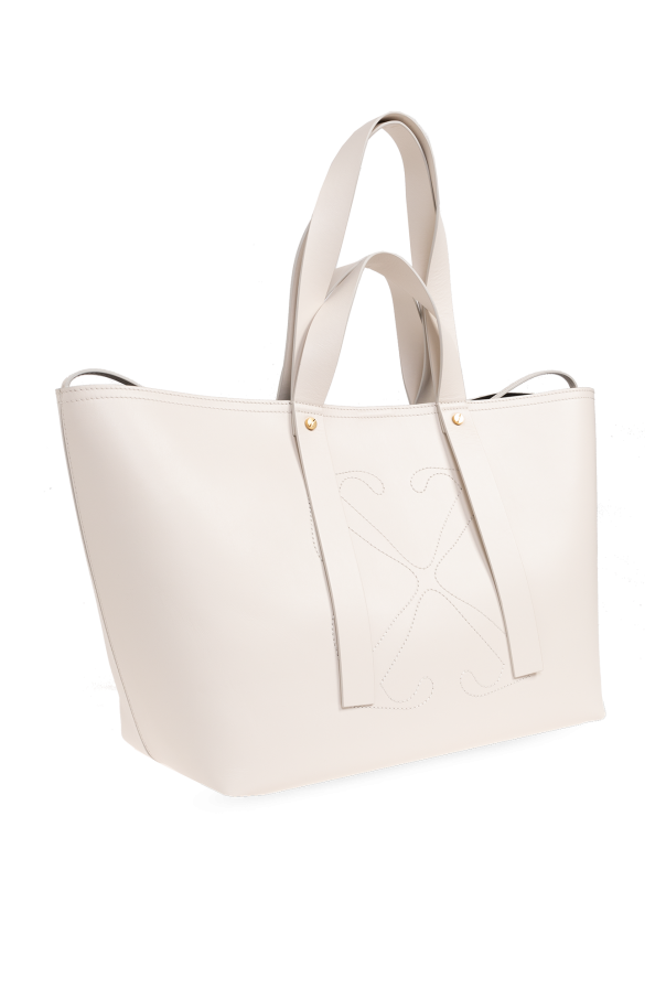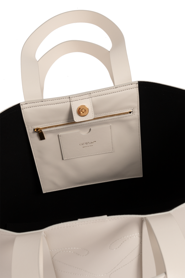 Cream ‘Medium Day Off’ shopper bag from Off-White. Made of calf leather, this model features a snap closure, cream logo embroidery, two half-round handles, gold-tone metal hardware and one internal compartment with one zip pocket and one card slot.