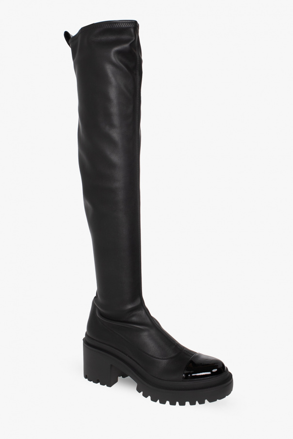 Black heeled boots from Giuseppe Zanotti. Crafted from leather and fabric, this model sits on a black rubber sole and features a glossy toe and distinctive stitching details.