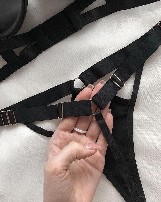 Сексуальний комплект білизни Weiyesi з екошкіри, складається з бюстгальтера на поролоновому push-up з незнімними регульованими бретелями і зі стрепами, а також стринги на стрепах, стандартної посадки.Стан: НовийКолір:- Чорний