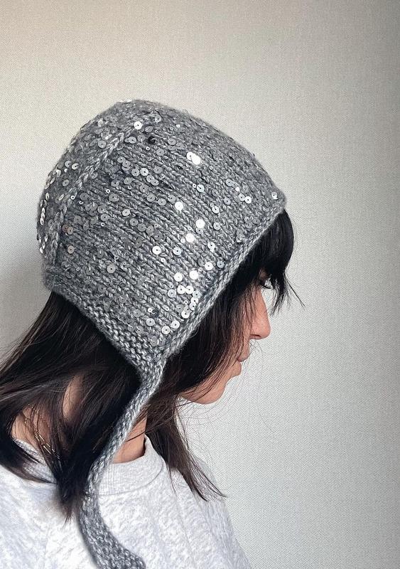 Ангоровый чепчик с пайетками. Женская шапка чепчик, модный тренд. Пушистый чепец с пайетками и завязками, ручная работа. Связан с премиальной ангоровой пряжи с пухом кролика с королевскими пайетками. Мягкий, не колючий, пушистый и теплый.
