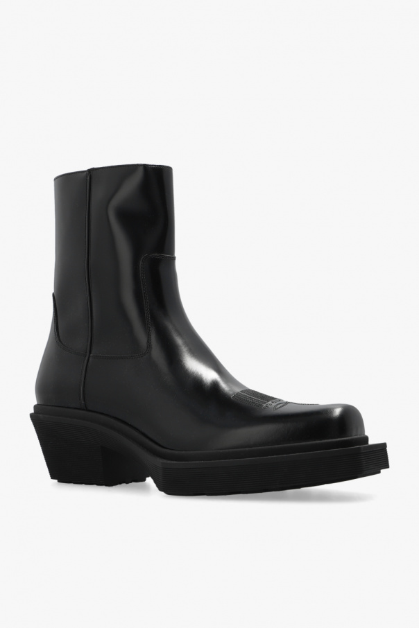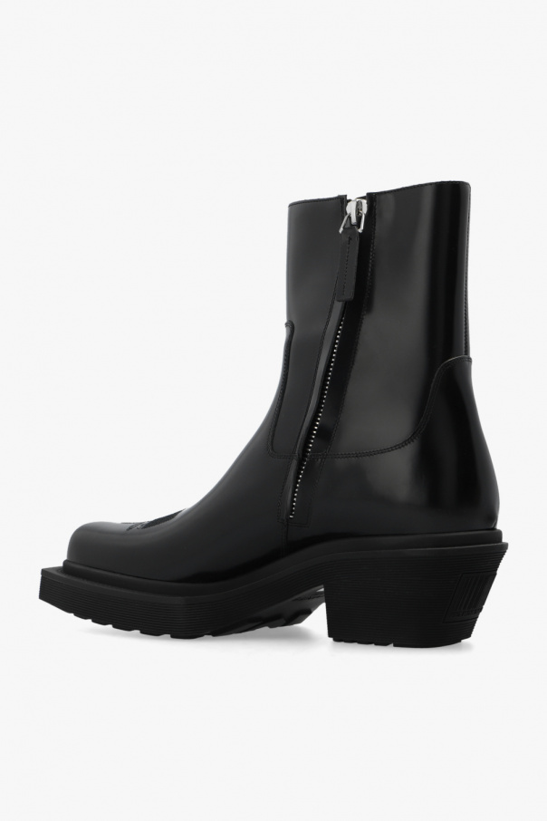 Black heeled ankle boots from VTMNTS. Crafted from patent leather, this pair features a side zip, decorative stitching, the brand’s signature barcode motif and black rubber sole.